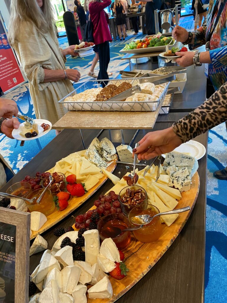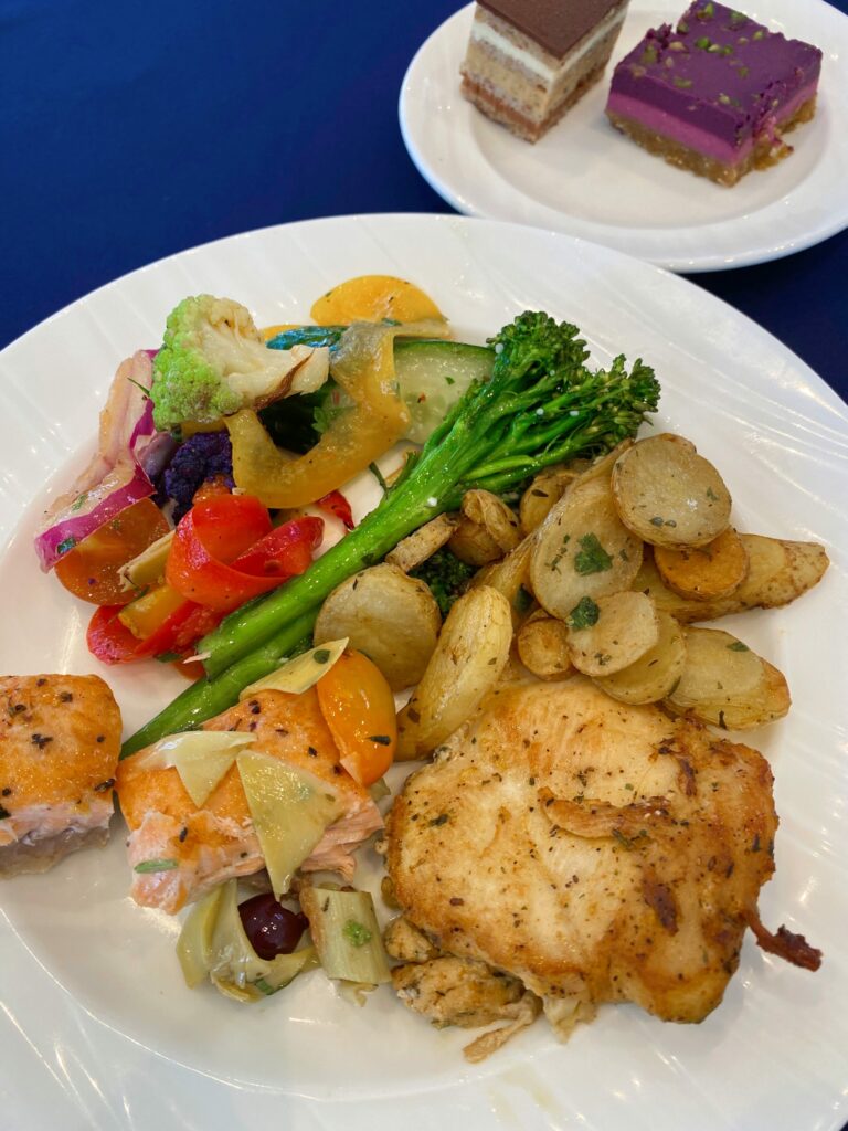 The cockatil hours had sushi one night with multiple types of sushi and mini poke bowls, and the second night was giant charceuterie spreads, hummus, and veggies. The lunches were protein-dense (salmon and chicken) with lots of veggies, and seasoned potatoes, soups, and gluten-free and vegan dessert options.