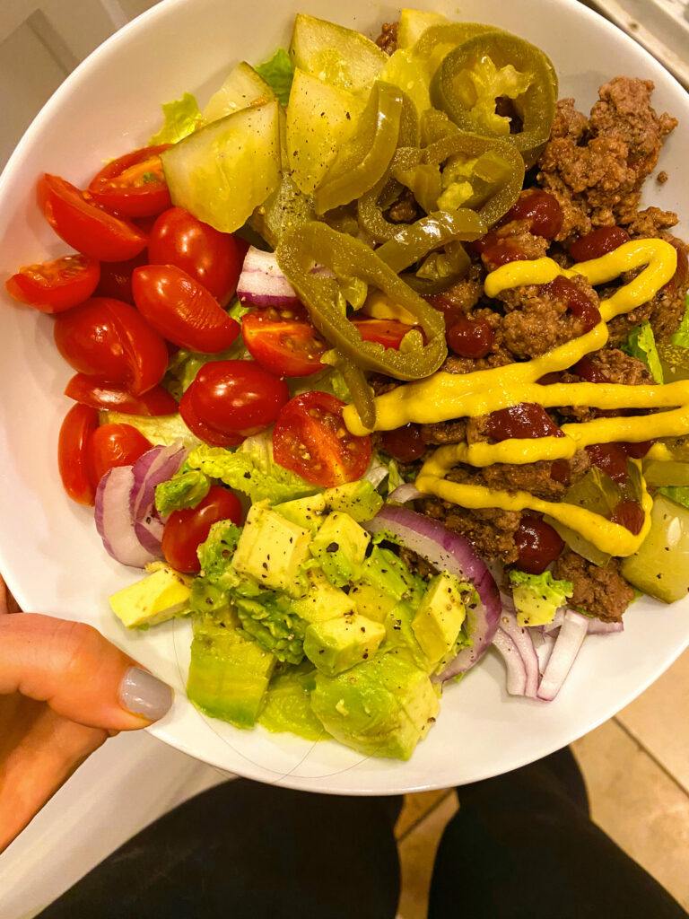 We love burger bowls. I cook the patties earlier in the day, then serve over lettuce with red onion, tomatoes, pickles, fries (Alexia waffle fries are our fave), and a little secret sauce.