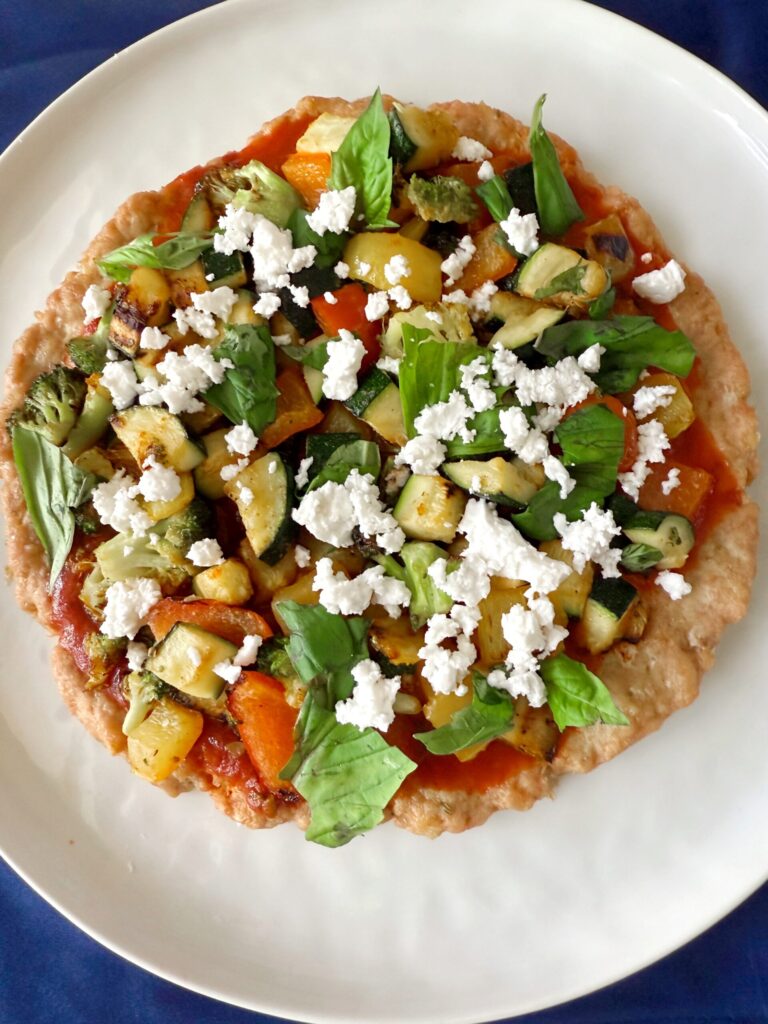 Preheat oven to 375°F. Line a baking sheet with parchment. Mix chicken and spices, then flatten into a 12–14 inch disc (about ¾ – 1 inch thick – basically a giant burger patty). Bake 25 minutes until internal temp hits 165°F. Add marinara and veggies, bake 5 more minutes, and finish with fresh basil and feta.