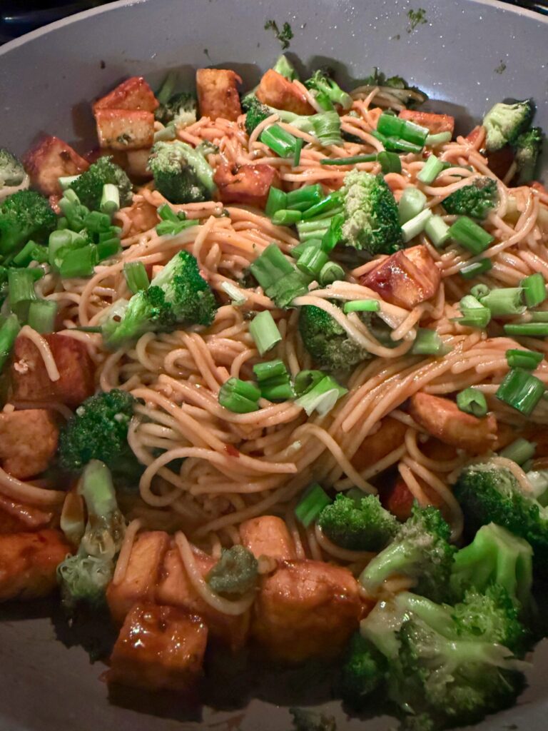 The kids love tofu, so I try to include it about once a week. I drain the tofu, wrap it in paper towels, and put a heavy pan on top for 10–15 minutes. Then I sauté it with veggies and toss with cooked noodles and an easy sauce, like a homemade peanut butter sauce or a Kevin’s sauce.