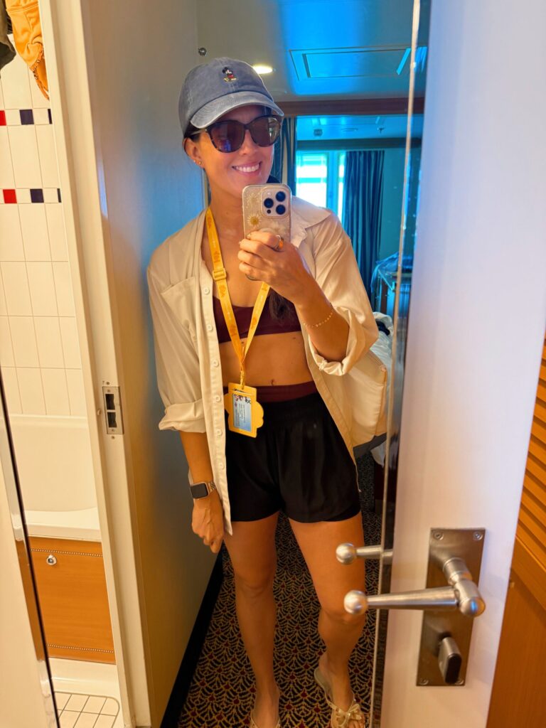For cruises, I usually bring something comfy during the day, especially since I might work out. So I’ll wear lululemon and a Disney hoodie or pullover on the ship. At night, I’ll change for dinner into a dress and either a lightweight jacket, or a dress that has sleeves because it’s always a little bit chilly at night.